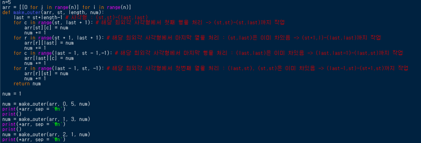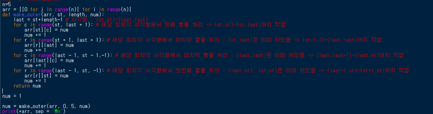 for c in range(last - 1, st - 1,-1): # 해당 최외각 사각형에서 마지막 행을 처리 : (last,last)은 이미 차있음 -> (last,last-1)~(last,st)까지 작업